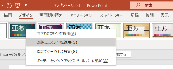 そして、任意のデザインを右クリックして、「選択したスライドに適用」を押します。