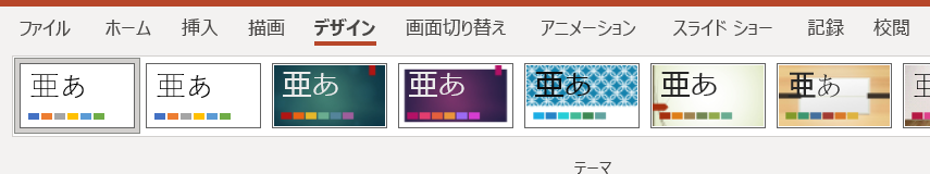 スライドを選択した状態で、[デザイン]タブに移動しましょう。