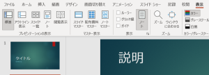 標準の表示に戻したい場合には、再度、[表示]タブからプレゼンテーションの表示を[標準]にもどすだけです。